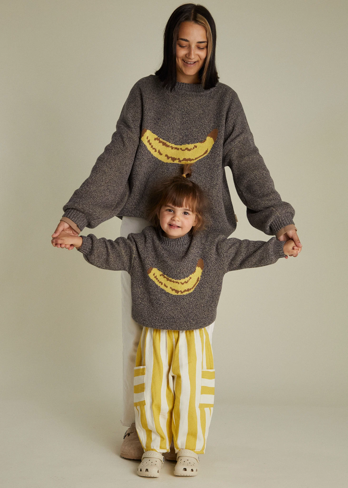 In 100% organic cotton – using our signature twisted yarn technique – this premium quality unisex knitted jumper has a beautiful blend of navy and stone-grey colouring, and is playfully patterned with an oversized banana motif in a rich golden yellow and brown. With the same oversized, slouchy fit that you’ve come to love from us, the Lori sweater brings you a brand-new shape – featuring balloon-shaped cuff sleeves, dropped shoulders and ribbed cuffs on the hem, wrists and neckline.